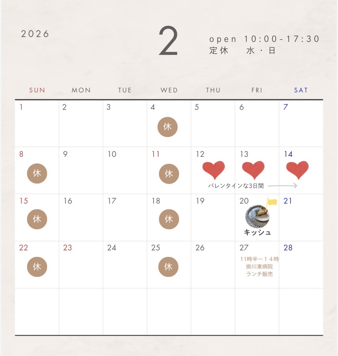 2月の予定です 2026 1/29 nimes お知らせ 2026年1月29日 まだまだ、寒いですが、 春に向けてアクセサリーや ブローチがたくさん入荷しています。 バレンタイン❤️なので、 ガトーショコラ、カヌレのセットなど ご用意する予定です。 どうぞ、今月もよろしくお願いします。 nimes nimes お知らせ nimes 菊川市手芸屋 みどりや yukichicaのガトーショコラ アクセサリー バレンタイン イベント 焼き菓子菊川市みどりや手芸屋 イヤリング ブローチ ビーズアクセサリー イヤリング 焼き菓子 ガトーショコラ ギフト ガトーショコラ パウンドケーキ ガトーショコラ バレンタイン カヌレ カヌレ菊川 きくがわ 菊川市手芸の店 ギフトアイテム ギフト雑貨アクセサリー クッキー 焼き菓子 雑貨屋 ニーム よかったらシェアしてね! URLをコピーしました! URLをコピーしました!