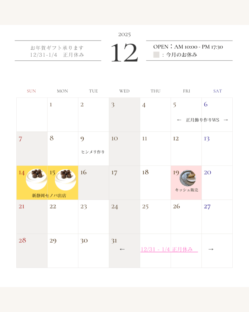 2025年12月の予定です。 12/15 セノバ出店中ですが、 nimes open12/16 振替休業 年末に向かって、新静岡セノバにて出張販売がありす。 お正月のワークショップや、キッシュの日、お年賀など、お気軽にお問い合わせください😌 温活アイテムな雑貨が並... 入荷しました