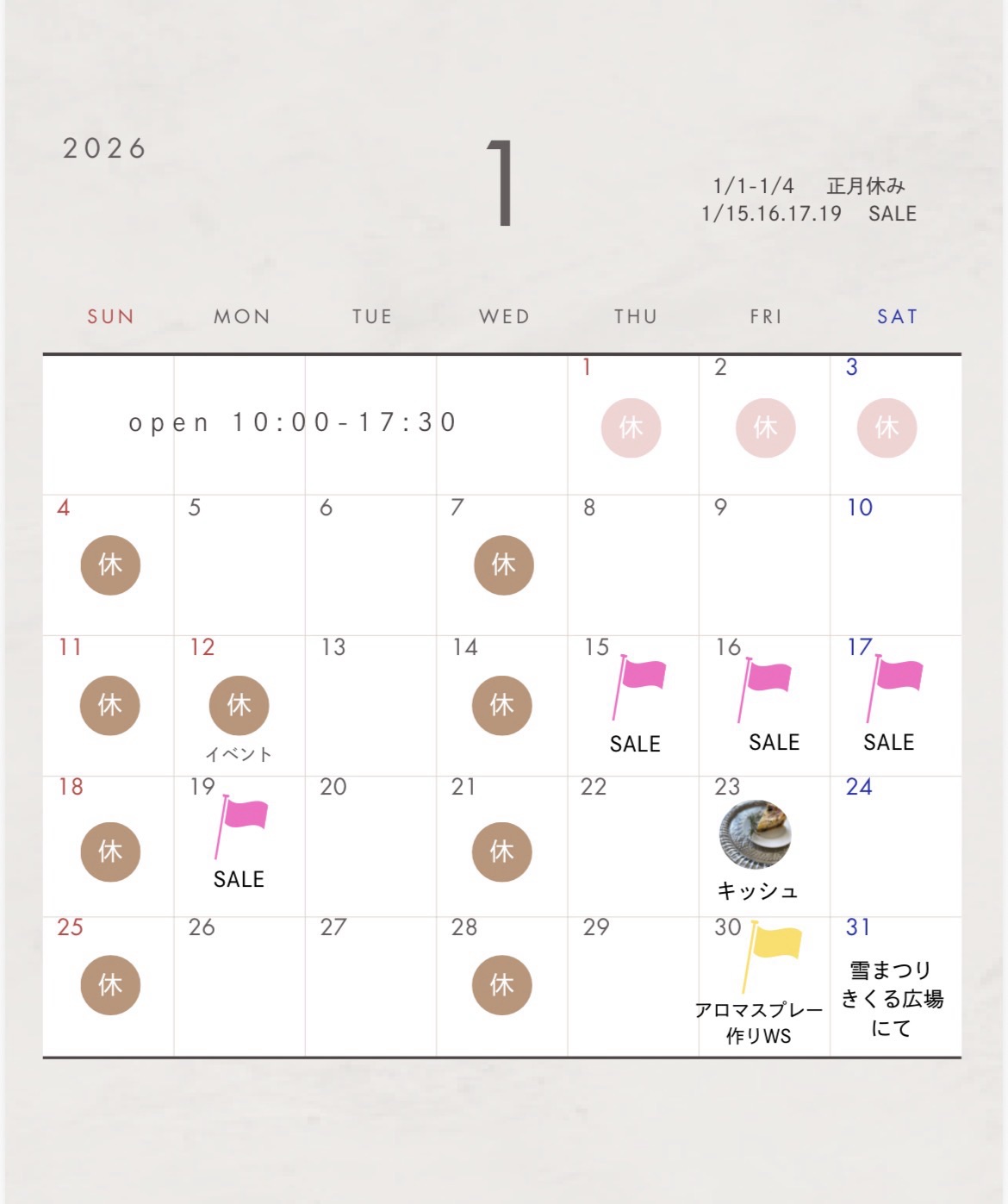 2026年 今年もどうぞよろしくお願いします。 1月は、SALEがあったり、 月末にはnimes前の広場にて雪祭りが 開催されます。 SALE時には、日頃の感謝を込めて 雑貨20%オフとさせていただきます。 この機会にぜひ、いろいろ 手に取ってください。 お待ちして... YUKiCHiCA 焼き菓子